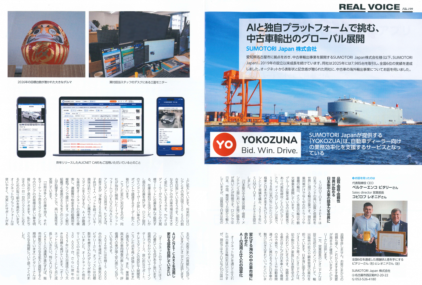 SUMOTORI Japan has been featured in the REAL VOICE series of AUCNET, one of Japan’s key B2B auction and remarketing platforms for used vehicles. In this article, AUCNET introduces our company as a rapidly growing exporter that combines the competitiveness of Japanese used cars with a strong focus on digitalization and process efficiency.